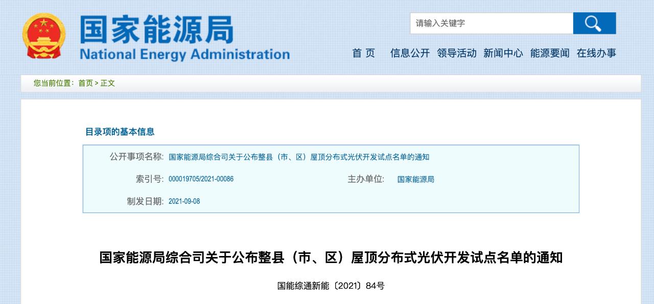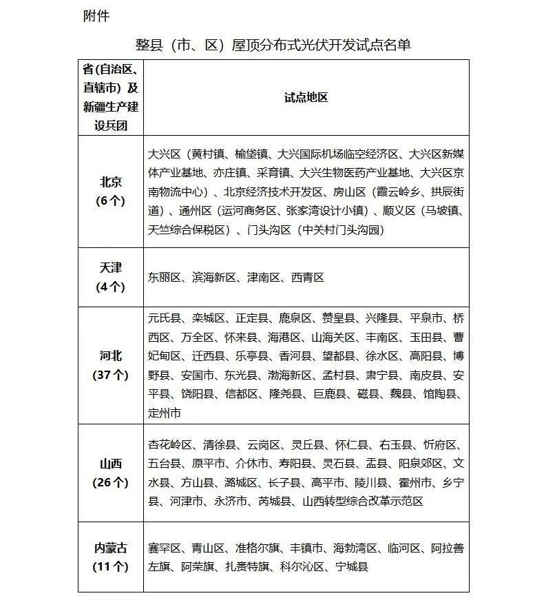 今年6月,我局印发了《国家能源局综合司关于报送整县(市、区)屋顶分布式光伏开发试点方案的通知》(以下简称《通知》)。目前,各省(自治区、直辖市)及新疆生产建设兵团均已按《通知》要求报送了试点方案。现将各地报送的试点县(市、区)名单予以公布,并就有关事项通知如下:一、各省(自治区、直辖市)及新疆生产建设兵团共报送试点县(市、区)676个,全部列为整县(市、区)屋顶分布式光伏开发试点,具体名单见附件。二、国家能源局将依托可再生能源发电项目开发建设按月调度机制,对试点地区各类屋顶分布式光伏发电项目备案、开工、建设和并网情况等进行全过程监测,按季度公布相关信息。三、国家能源局将于每年一季度对上年度各试点地区的开发进度、新能源消纳利用、模式创新以及合规情况等进行评估并予公布。四、2023年底前,试点地区各类屋顶安装光伏发电的比例均达到《通知》要求的,列为整县(市、区)屋顶分布式光伏开发示范县。五、试点工作要严格落实“自愿不强制、试点不审批、到位不越位、竞争不垄断、工作不暂停”的工作要求。各试点地区要改善新能源开发建设营商环境,降低屋顶分布式光伏开发建设非技术成本,减轻投资开发企业负担。试点过程中,不得以开展试点为由暂停、暂缓其他项目立项备案、电网接入等工作。对于试点过程中不执行国家政策、随意附加条件、变相增加企业开发建设成本的,将取消试点资格。非试点县(市、区)按既有相关规定继续开展各类光伏发电项目开发建设工作。六、各地电网企业要在电网承载力分析的基础上,配合做好省级电力规划和试点县建设方案,充分考虑分布式光伏大规模接入的需要,积极做好相关县(市、区)电网规划,加强县(市、区)配电网建设改造,做好屋顶分布式光伏接网服务和调控运行管理。七、各省级能源主管部门要加强对本地区试点工作的组织领导和工作指导,规范开发建设市场秩序,对试点工作中出现的问题和偏差要及时处理和纠正;要通过制定示范合同文本等方式,切实保护农户合法权益,对借屋顶分布式光伏开发之机,以各种名目损害农民利益的,要严肃查处,纳入不良信用记录和失信惩戒名单。派出机构要加强对试点地区政策执行、开发进度及电网接入、并网消纳情况的监管,确保整县(市、区)屋顶分布式光伏开发试点工作规范开展。八、国家能源局将组织专家通过现场调研等方式,加强对各地区试点工作的指导和协调,及时完善政策措施。各试点地区对工作推进过程中发现的问题要及时向国家能源局反映。