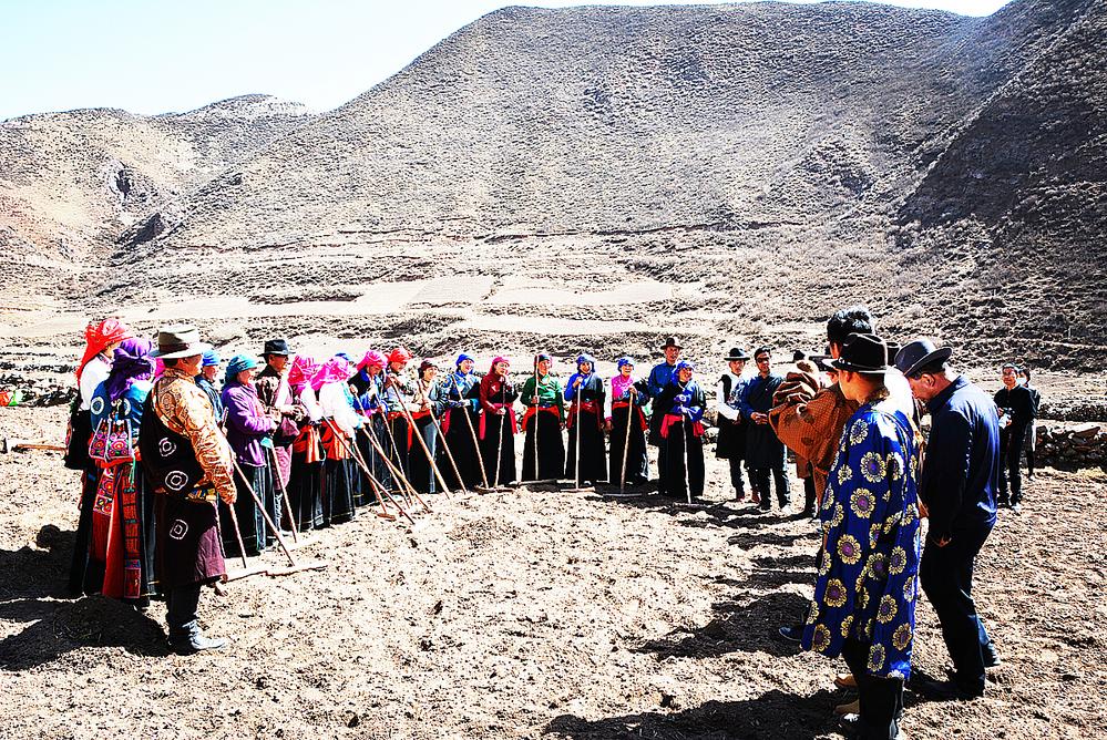 没参与过开耕节的朋友们可能觉得他们应该会换上干活的衣服下地种田,实际上,开耕节这天,大家都会沐浴更衣,打扮得漂漂亮亮,阿佳们头戴次仁金果、发编彩色发带,精心打扮,个个光鲜靓丽。带着自家蒸制的面食和油炸果子,赶着由经幡、哈达装扮的牦牛涌向待垦的农田。仪式开始前,有专人站在高处向人群抛撒糖果,村民捡到糖果, 寓意着今年能大获丰收,生活幸福美满。在桑烟袅袅升起的田间,两牛横抬一“杠”,“杠”后接续辕犁,俗称“二牛抬杠”,一人在前面牵牛引路,一人信手扬鞭在后面扶犁吆喝,翻开春日大地上的第一份希望。阿佳们手拿榔头,平整土地,将新年的第一粒麦种深埋在疏松的土壤中,田地就此焕起了生机与活力。