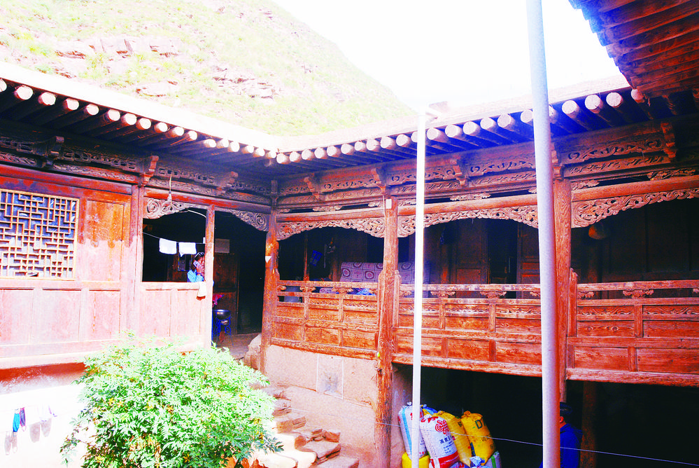 当然有关塔加村的故事,远不止这些。如今在塔加村,最吸引人的还是那些独具特色的建筑。和其他地方的院落不同的是,塔加村的四合院只留有一个天井,四面都是回廊,房屋十分密集,上下层次感很强,建筑风格与西藏后藏有些地区的建筑相似。房屋为石木结构,但坐北朝南的正房又融入汉族庭院建筑风格,外墙由石块砌成,内部柱、梁、椽以及隔墙用的是木料。房檐、门窗、回廊栏杆和墙裙大都是精美细巧的雕花,图案精美,雕工精细,刷一层清漆显得朴素美观。