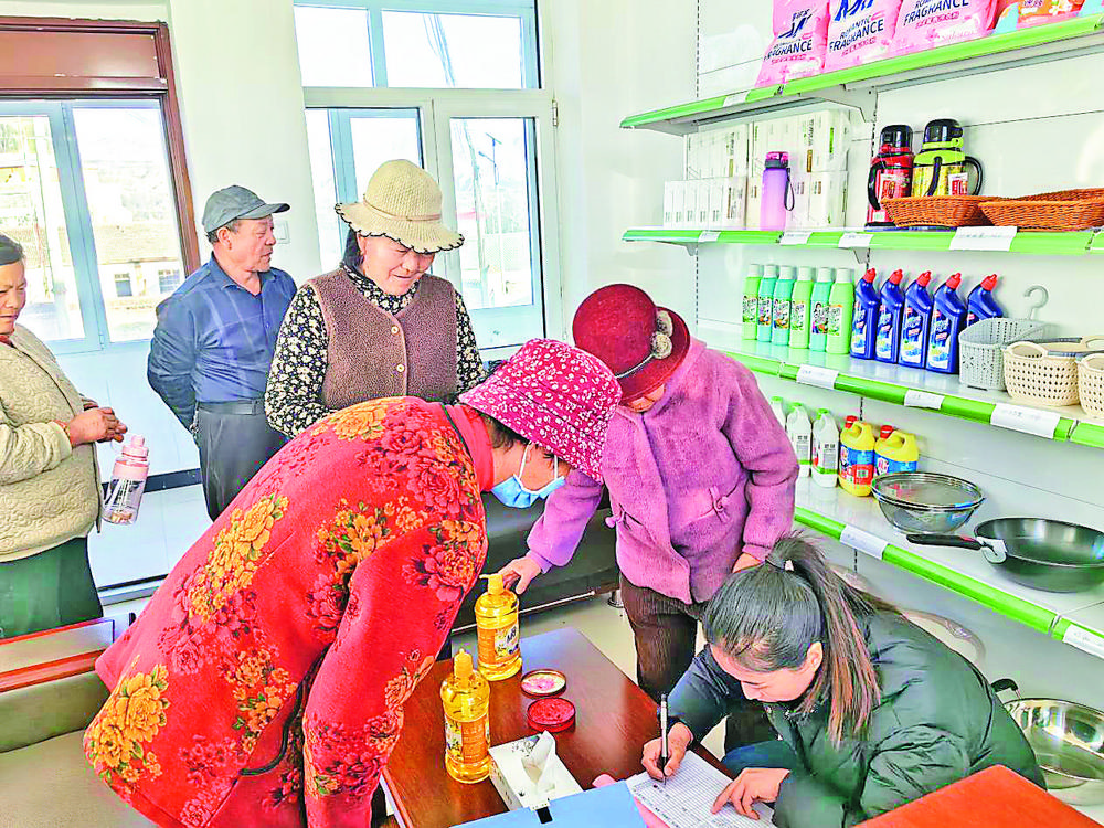“我的积分可以兑换一瓶洗手液。”“我的可以兑换一桶洗洁精。”“我的可以兑换一提纸……”此时,群科镇雪什藏村几位村民正在浏览着货架上标注积分的物品,并按照自己参与村上各类志愿服务活动获得的积分挑选物品,雪什藏村党支部书记张德西站在一旁,仔细核对登记,依次兑换物品,村民签字确认并摁上手印。