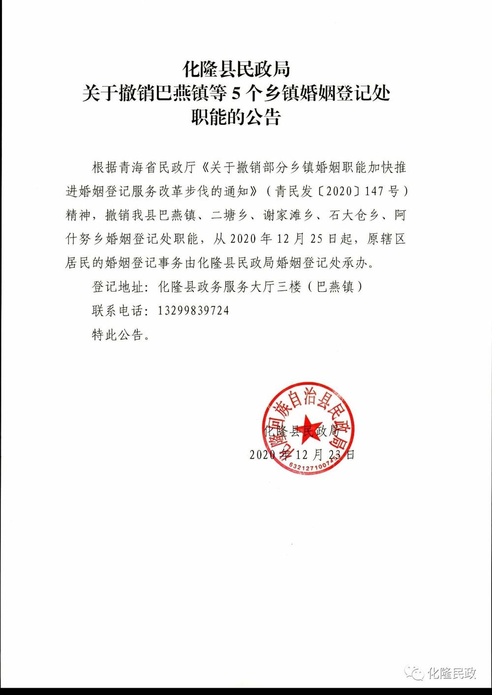 根据青海省民政厅《关于撤销部分乡镇婚姻职能加快推进婚姻登记服务改革步伐的通知》(青民发〔2020〕147号)精神,撤销我县巴燕镇、二塘乡、谢家滩乡、石大仓乡、阿什努乡婚姻登记处职能,从2020年12月25日起,原辖区居民的婚姻登记事务由化隆县民政局婚姻登记处承办。