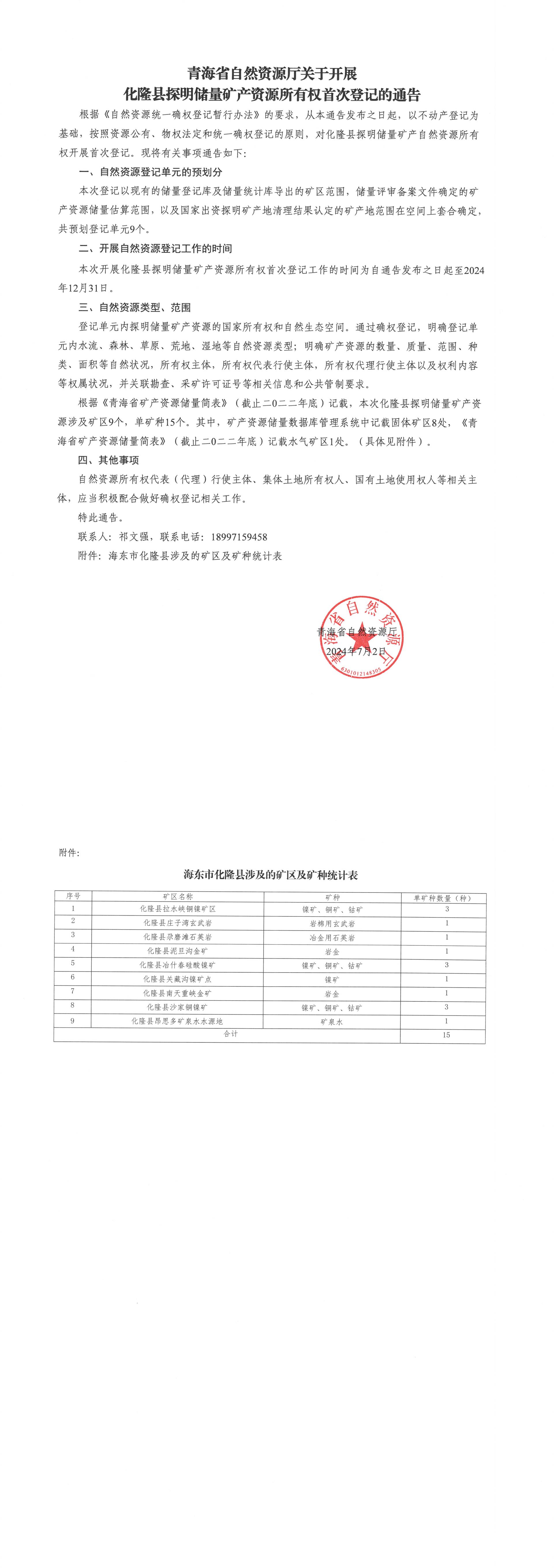 青海省自然资源厅关于开展化隆县探明储量矿产资源所有权首次登记的通告
