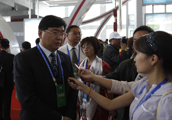地委委员、行署常务副专员初军威在海东馆前接受采访