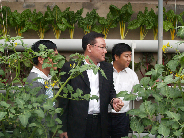 地委委员、行署副专员初军威陪同海东地区邀请的青洽会嘉宾参观互助农业园区