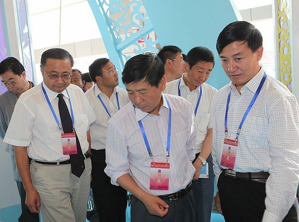 地委书记于丛乐向省委书记、省人大常委会主任强卫和来宾介绍海东展馆的展品
