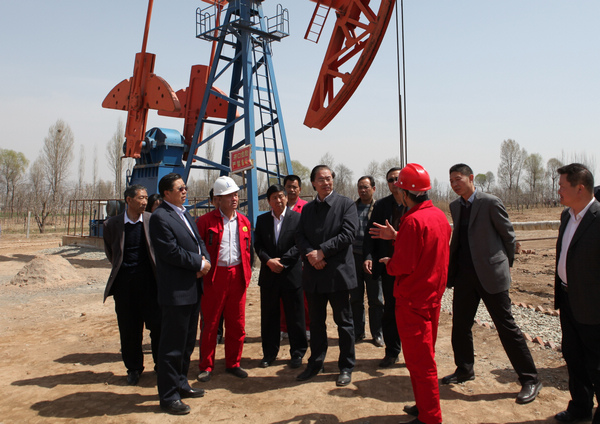 海东地委书记于丛乐、地委副书记行署专员金长华在油田视察石油采掘