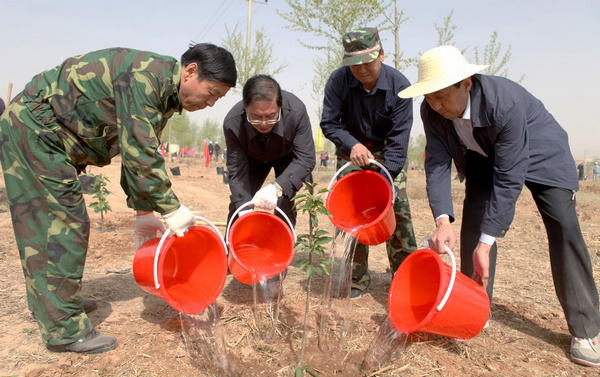 地委书记于丛乐,地委副书记行署专员金长华等地区领导为树苗浇水