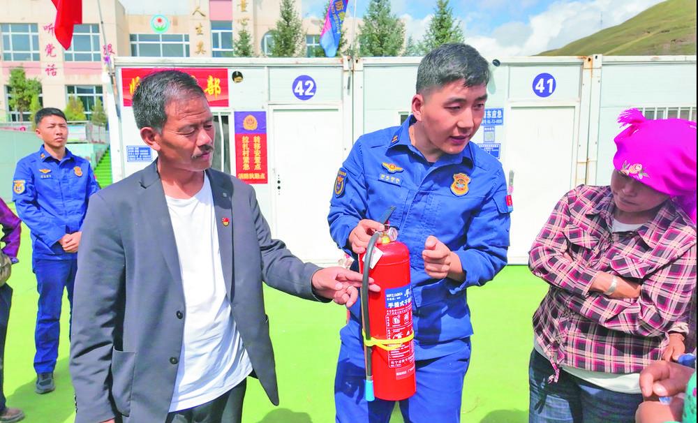 9月5日15时,当记者再次来到安置点,看到更登正与消防队员一起,用藏语耐心地给村民们讲解消防器材使用方法。讲解结束后,他又逐个走进板房,询问村民的生活情况。