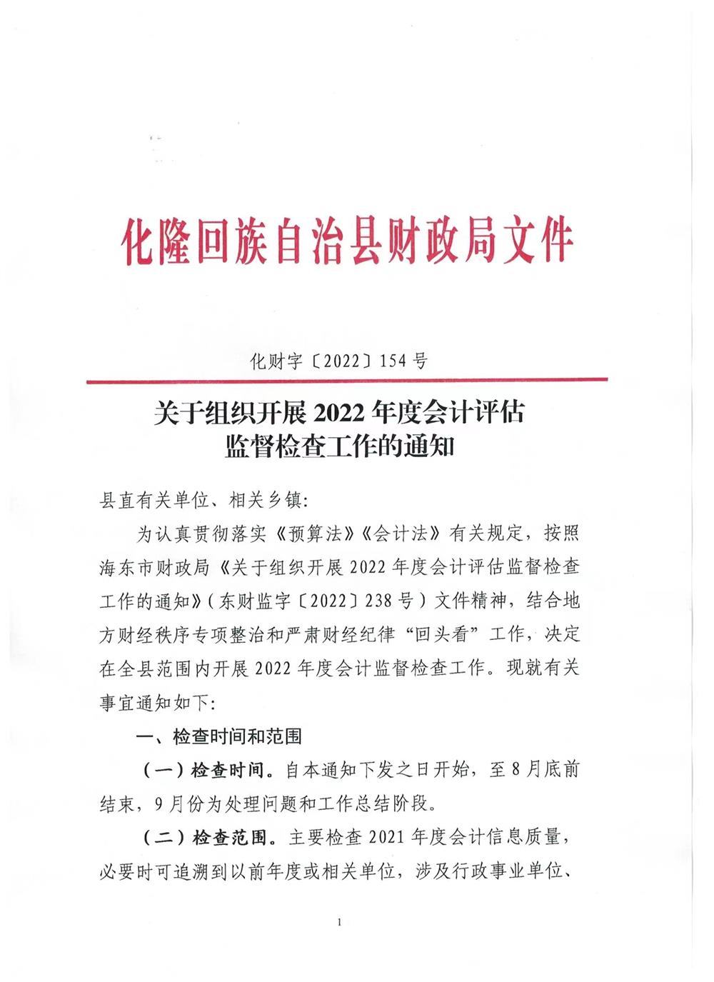 化财字(2022)154号关于组织开展2022年会计评估监督检查工作的通知