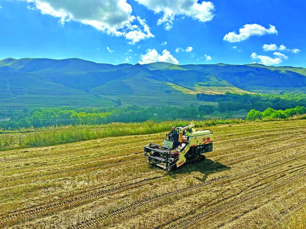 眼下,化隆县二塘乡1666.67公顷青稞正处收获旺季,风携青稞的清甜漫过田埂,田间地头收割机的轰鸣与农户的笑语交织成丰收乐章。